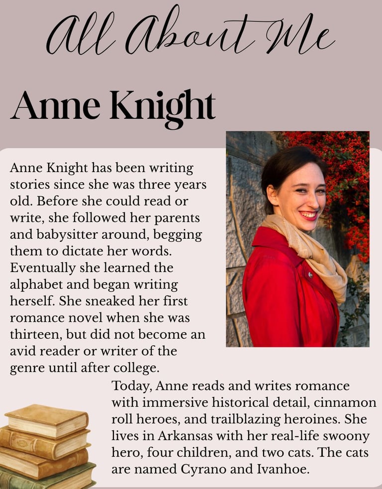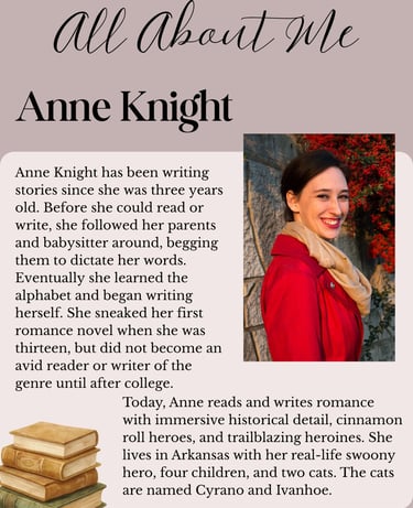 Anne Knight has been writing stories since she was three years old. Before she could read or write, she followed her parents and babysitter around, begging them to dictate her words. Eventually she learned the alphabet and began writing herself. She sneaked her first romance novel when she was thirteen, but did not become an avid reader or writer of the genre until after college.
